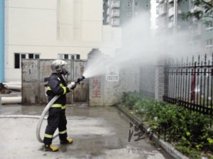 消防官兵噴射水霧,稀釋空氣中的燃?xì)鉂舛取?/p>