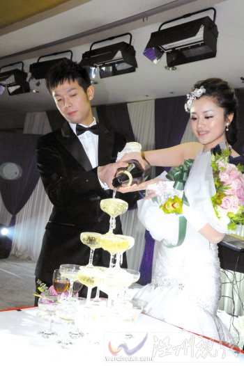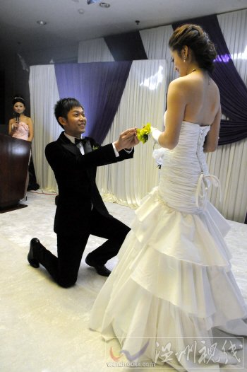 7點,在現場近千人的祝福聲中,陳鄭潔挽著朱啟南走近宴會現場,訂婚儀式開始,單膝下跪求婚、一同品嘗巧克力、切蛋糕、倒香檳、喝交杯酒、香吻……這位號稱“神奇小子”的射擊奧運冠軍的訂婚儀式每一個環節都很浪漫。一位工作人員告訴記者,朱啟南的求婚鉆戒是3克拉。