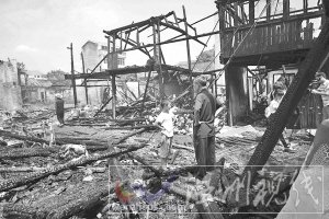 記者采訪現(xiàn)場(chǎng)村民了解到,楓林鎮(zhèn)圣旨門(mén)街火災(zāi)是6月26日晚上10時(shí)20分左右發(fā)生的,一座民居起火后迅速向四周蔓延,“大火燒著了電線,噼里啪啦地響,不少人嚇得顧不上拿東西就逃出來(lái)了。”從現(xiàn)場(chǎng)的殘骸來(lái)看,古街約50米范圍內(nèi)緊挨著的老宅接連被波及,一棵大樹(shù)的部分枝椏也被燒得焦黑。