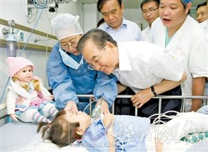 7月28日,中共中央政治局常委、國(guó)務(wù)院總理溫家寶來(lái)到了溫州,察看“7·23”甬溫線特別重大鐵路交通事故現(xiàn)場(chǎng),悼念事故遇難者,看望在事故中受傷的人員,并慰問(wèn)遇難者親屬。這是溫家寶特地來(lái)到溫二醫(yī)看望受傷的小伊伊。兩歲零八個(gè)月的小女孩項(xiàng)煒伊是這起事故中最后一名獲救者。新華社記者黃敬文攝