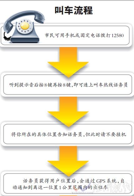 撥打12580叫車熱線并告知自己的位置后,用戶需要等待30秒至1分鐘,如超過這個時間還沒有出租車司機接受叫車業務,話務員會問詢你是要繼續等待還是稍后再次撥打。如果用戶許可,話務員還會將乘客聯系號碼發送到出租車的GPS裝置上,以便聯系。撥打12580按市話費標準收費。