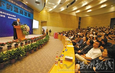 2008年11月,“全球視野下的溫商發展”論壇在溫州市人民大會堂舉行,2004年諾貝爾經濟學獎獲得者愛德華·普雷斯科特作了精彩演講。 翁卿侖 攝