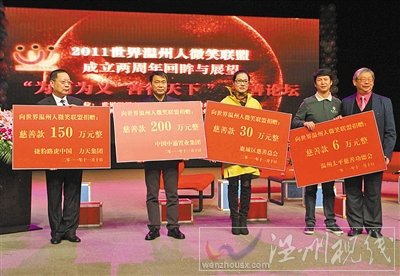 而“世界溫州人微笑聯盟”,只是溫商“善行天下”力量的一次集中爆發。其實,在外溫商群體一直在行商的同時致力于行善,在世界各地默默而堅韌地樹立起溫州人善行天下的形象。僅拿2011年年終各地溫州商會的年會來說,南京溫州商會在年終聯誼會上,拿出了20萬元慰問當地百名環衛工人及貧困大學生;太原市溫州商會五周年慶典暨第二次會員代表大會上,新當選的太原溫州商會會長、山西亞佳機電集團有限公司董事長黃志強,向太原市慈善總會捐贈價值128.6萬元的“暖冬”物資,并對當年剛入學的太原市3所高校的20名貧困大學生進行一對一資助,直至大學畢業;同是去年12月舉行的福州溫州商會10周年慶儀式上,福州溫州商會會長張文彬將一張金額110萬元的支票,交給南平政和醫院的代表……
