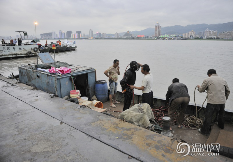 溫州車(chē)渡碼頭轎車(chē)墜江救援人員(孫新尖/攝)