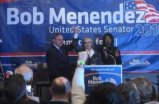 希拉里在籌款宴會上大聲為民主黨參議員拉票,“我們可以相信鮑勃·梅嫩德斯”“距離選舉日還有三周,是時候出去投票了”。