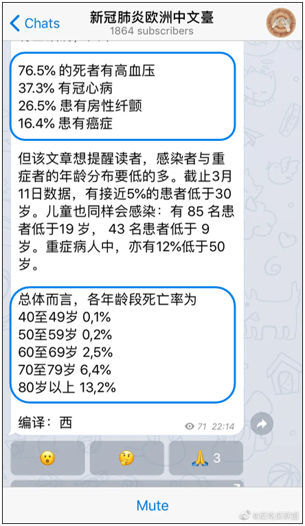 我們不準(zhǔn)確的說:美國70-79歲的老人感染病毒后,有6.4%的人會死亡,而這6.4%的人里面又只有6%的人完全是死于冠狀病毒。
