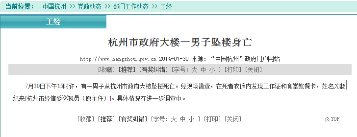 2014年7月30日,杭州有位官員墜樓:今日下午3點左右,浙江省杭州市府辦公樓內,一名男子從20層墜樓。警方確認墜樓男子是杭州市經濟和信息化委員會巡視員趙紀來。墜樓原因還不清楚,杭州巡視員趙紀來墜樓是跳樓還是自主墜樓?具體情況警方正在調查。