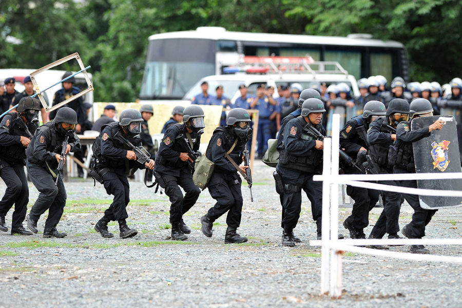 當(dāng)?shù)貢r(shí)間9月3日,幾名菲律賓精英部隊(duì)成員在演示配合突擊技巧。調(diào)查委員會(huì)將傳喚內(nèi)政部次長(zhǎng)、警察總長(zhǎng)、警方談判人員、馬尼拉市政副市長(zhǎng)等接受詢問(wèn),4日則傳喚馬尼拉警署相關(guān)警官、巴士司機(jī)、事發(fā)當(dāng)天載挾持者門多薩到馬尼拉的一名神秘女子“蘿絲”,以及在事發(fā)時(shí)訪問(wèn)門多薩的廣播電臺(tái)記者。