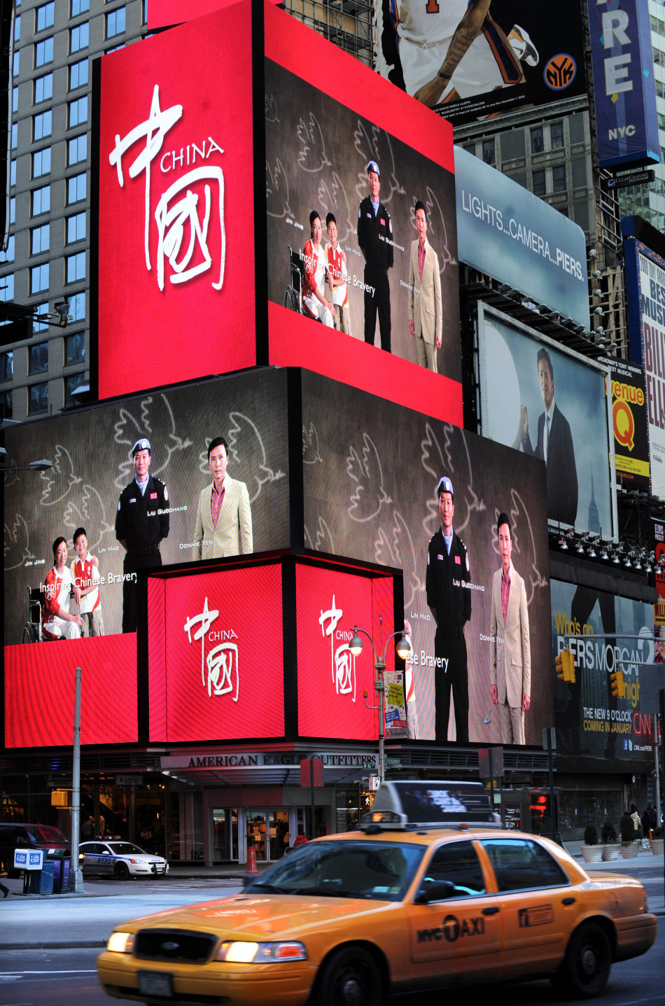 1月17日,中國國家形象片,國家形象宣傳片在紐約時報廣場電子屏播出,美國紐約時報廣場的電子顯示屏正在播出《中國國家形象片——人物篇》。 當日,《中國國家形象片——人物篇》開始在紐約時報廣場大型電子顯示屏上以每小時15次、每天共300次的頻率播出。至2月14日,中國國家形象片共計將播放8400次。《中國國家形象片——人物篇》中包括了楊利偉、姚明等各領域優秀代表以及普通百姓,旨在向全世界展示立體的中國。 新華社記者申宏攝