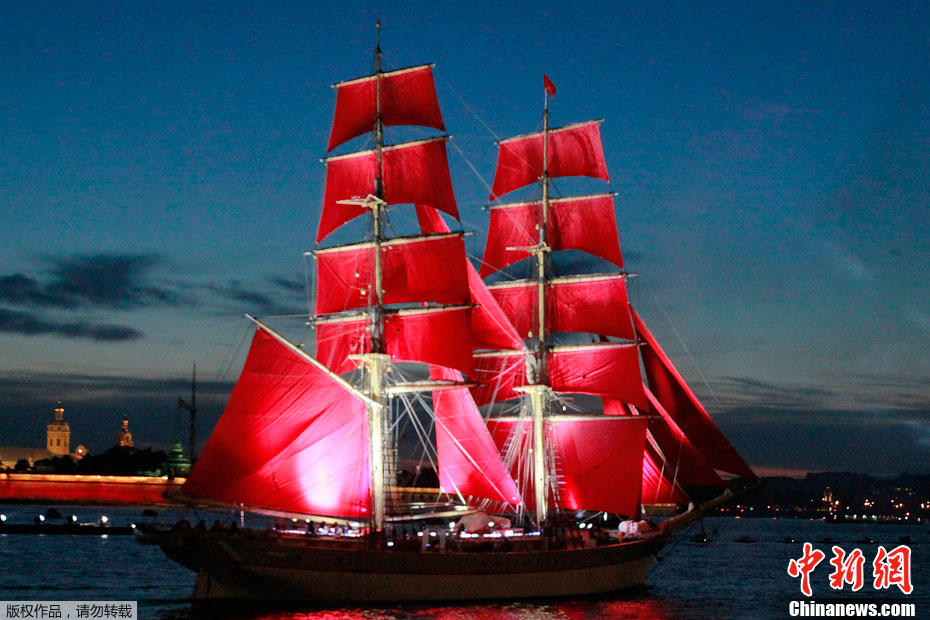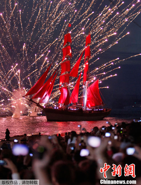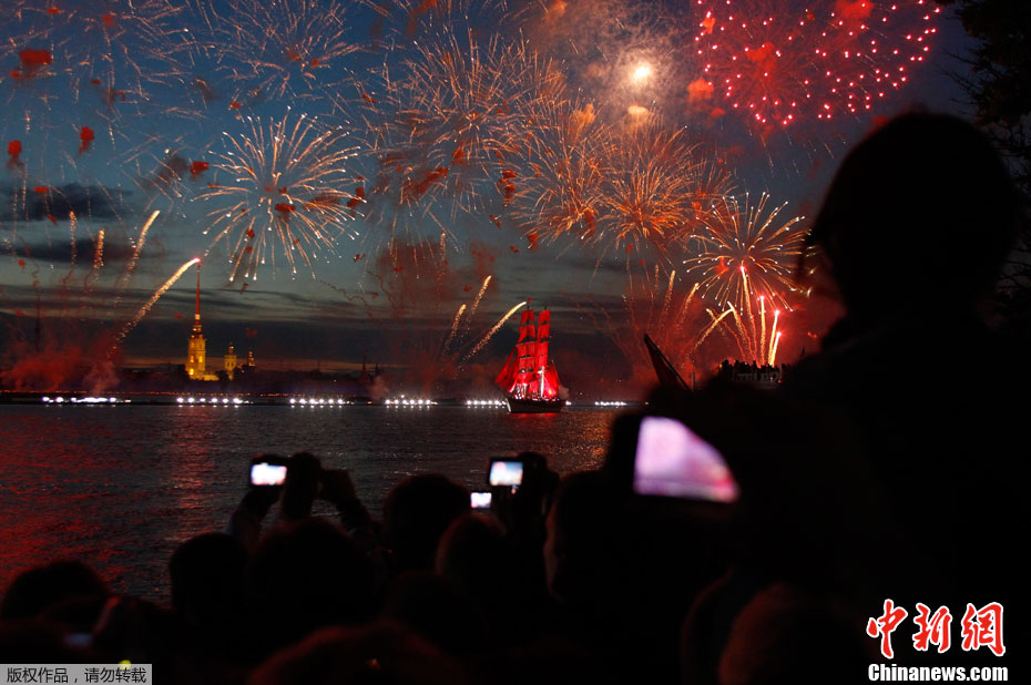 圣彼得堡紅帆節煙花燦爛精美圖片。2011年6月19日,俄羅斯圣彼得堡涅瓦河畔,人們參加“紅帆節”,觀看煙花表演。“紅帆節”是一年一度的慶祝中學畢業生的節日。每年夏至白晝前最后一個周五的夜晚,圣彼得堡都會舉辦“紅帆節”,俄羅斯紅帆節是為了讓所有的中學畢業生告別少年,在黎明來臨之際迎接人生新的階段。圣彼得堡紅帆節真是浪漫的節日,一個多么朝陽和美好回憶的節日,煙花燦爛,紅帆象征著生命旅途一帆風順,很美,很詩意的節日。