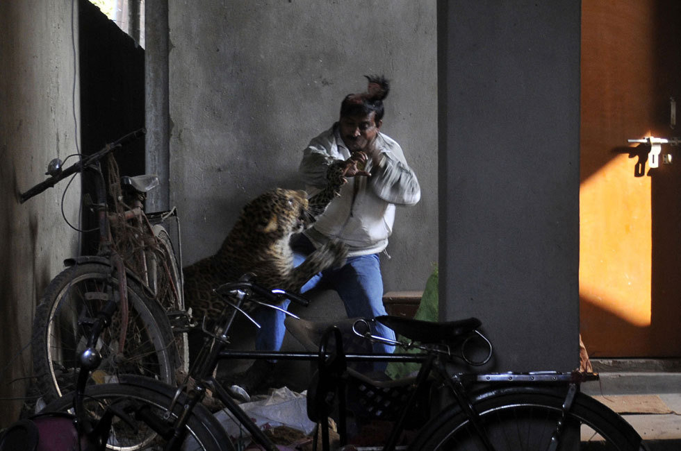 中國有傳說武松打虎的故事,那是古代誰也沒有看到,就在當代,就在2012年1月7日,印度古瓦哈提,一名男子男子徒手搏斗美洲豹,其英勇堪比武松打虎,印度古瓦哈提一頭美洲豹闖入當地一個居民區,3人遇襲受重傷。一名男子徒手搏斗美洲豹頭皮被抓掉一大塊,獻血流滿他的衣服,看起來傷得很厲害,其實只是外傷而已。圖為男子與美洲豹徒手搏斗,頭皮被掀起了一塊連著頭皮。