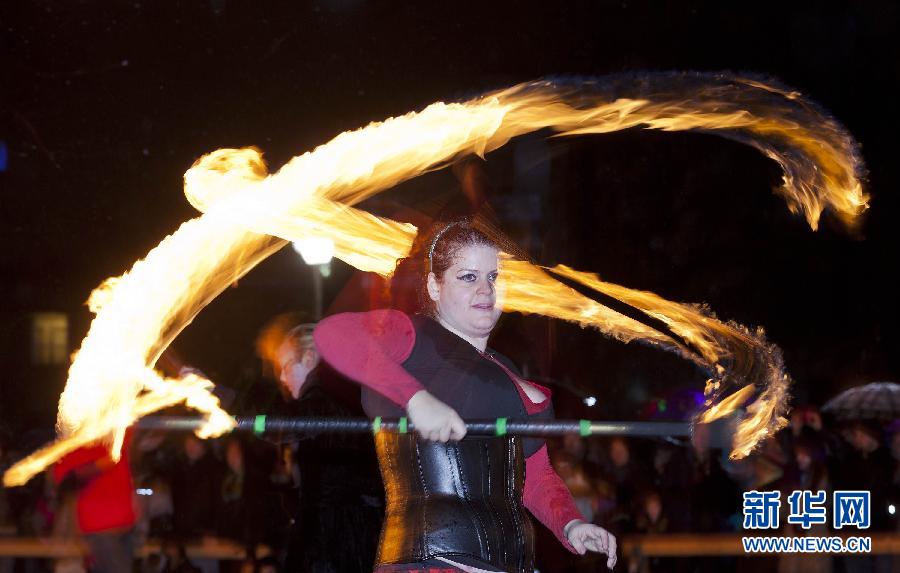 加拿大也過冬至節,2013年12月21日,在加拿大多倫多,多倫多舉辦第24屆冬至燈火節活動,數千名市民手持各式花燈和火把慶祝冬至節,參觀燈火表演。圖為一名女市民舞動火把慶祝節日。
