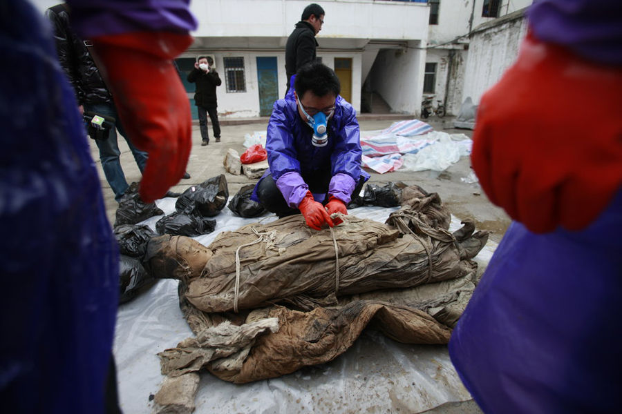 2011年2月24日晚,在江蘇省泰州市市區春蘭路延伸工程施工工地發現三副明代棺木,棺木木質優良,均系澆漿墓,墓葬距地表都在2米以上。3月1日,泰州博物館工作人員打開其中一副棺木。這些棺木里的人和泰州博物館前世無怨今世無仇,為什么要打開人家的棺木?