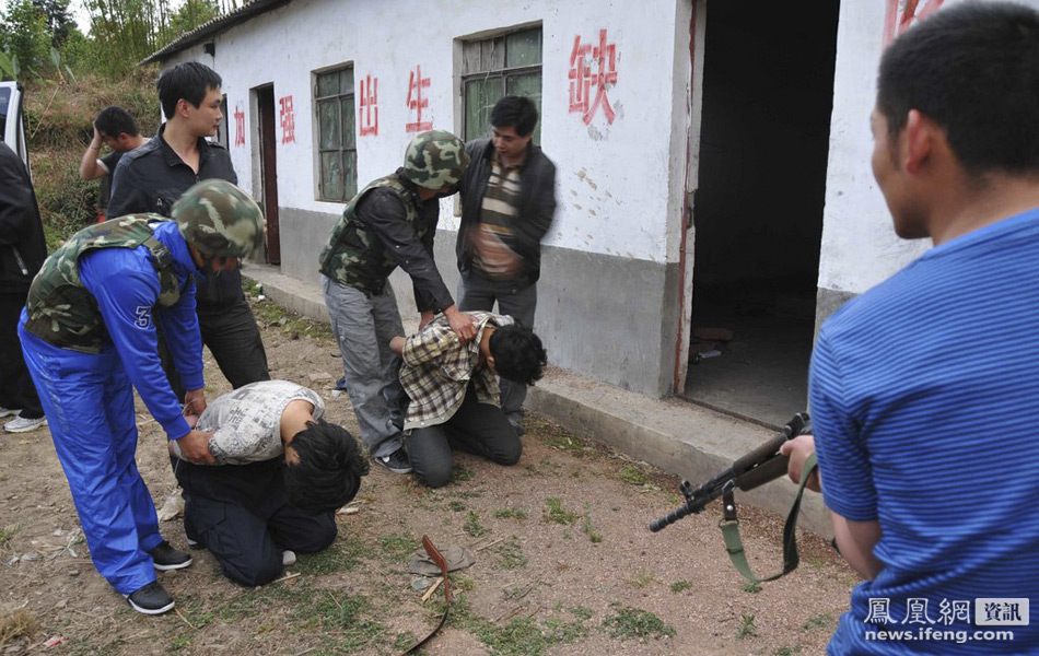 5月4日晚,13歲的云南曲靖籍男孩王錦方在被兩名持槍歹徒劫持20多個小時后,在便衣武警的快速破門行動中安全獲救。圖為特警戰士抓獲兩名嫌犯。
