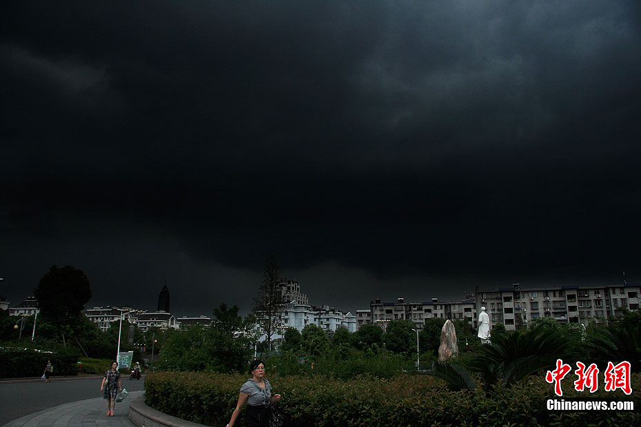 ,瞬間烏云密布,白晝如夜,暴雨如注,并伴有電閃雷鳴。強對流天氣帶來強降雨,市區多條馬路頓時一片汪洋。大約半個小時后,天空晴好如初。中新社發 李瑞昌 攝 圖片來源:CNSPHOTO