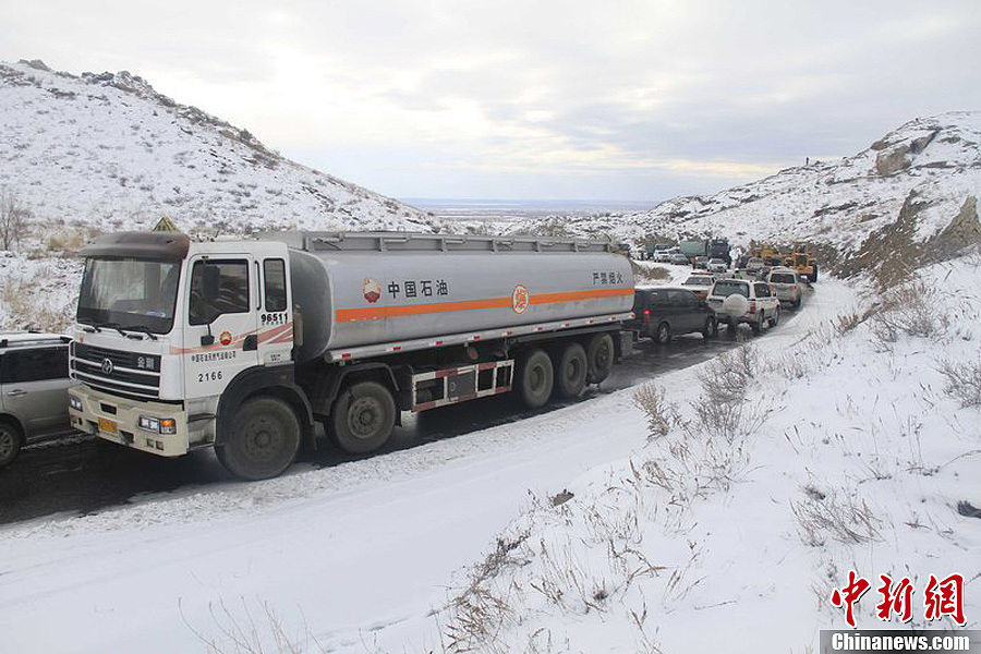 新疆大雪圖片,11月7日至8日新疆大雪范圍大降雪量大,新疆阿勒泰市下大雪造成216國道交通擁堵,因道路結冰汽車行駛緩慢,國道216線距離阿勒泰市7公里處發生大貨車側滑掉下路基,造成6公里的車輛滯留4小時,經阿勒泰市交警的疏導恢復通車。下大雪最大的危害就是路面結冰,雪天出行注意安全。