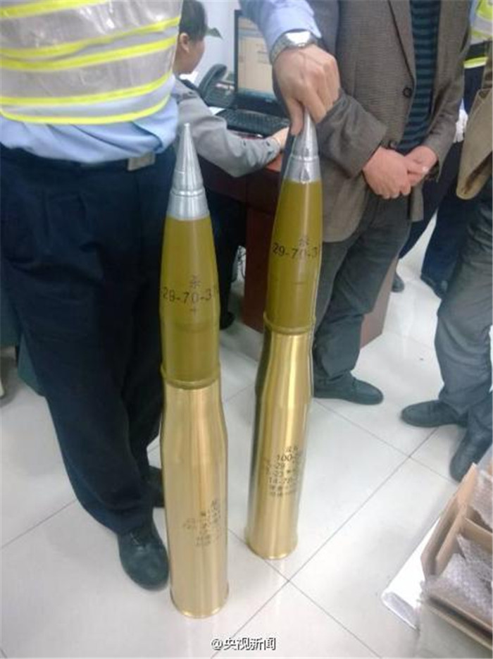警方安檢時查獲兩枚艦炮炮彈】2014年5月11日下午,上海市青浦區西岑鎮道口警方安檢時,在一輛汽車后備箱發現兩個包裹,用X光機檢查發現包裹里裝有兩枚管狀物品,經開箱檢查,發現是2枚100毫米艦炮炮彈,不過不是真的炮彈,只是炮彈的空殼,可能是作為收藏品收藏。
