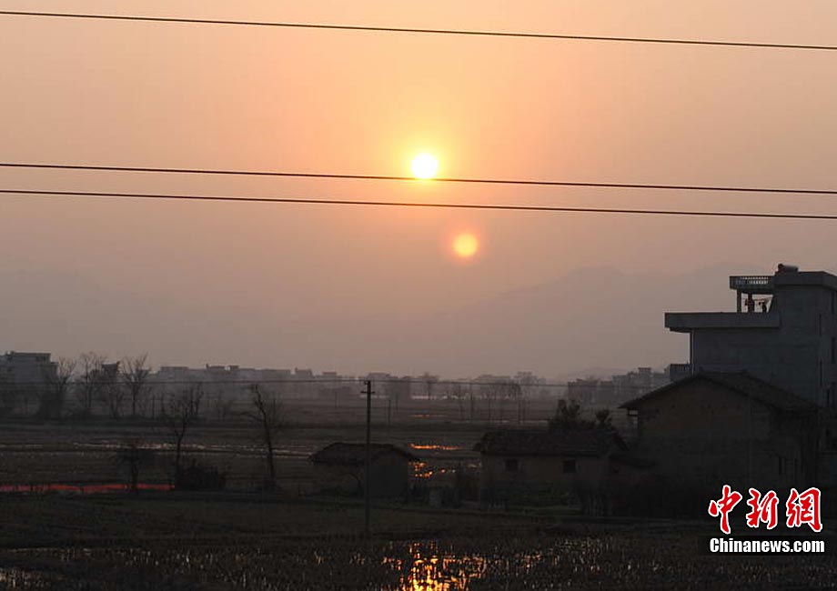 江西遂川“幻日”,天空中出現兩個太陽。1月16日,江西吉安市遂川縣西部上空出現一大一小兩個“太陽”的奇觀。這種奇異景象屬日暈的一種,被稱為“日暈和幻日現象”,系由于大氣中水汽經太陽光線折射后形成,多現于雨雪天氣之后。還好只是幻日,真要是兩個太陽,人肯定會被烤焦的。(李建平 何柳斌)
