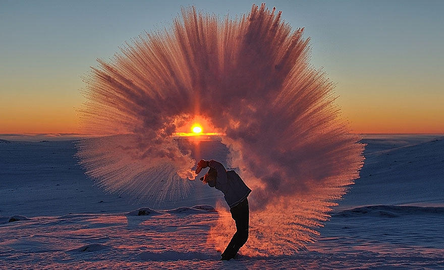 零下40度甩出一瓶熱水會是什么效果?在零下35度拋灑熱水試驗也差不多。加拿大攝影師邁克爾·戴維斯拍下了零下40度甩出一瓶熱水化作一團冰晶的過程,煞是好看。