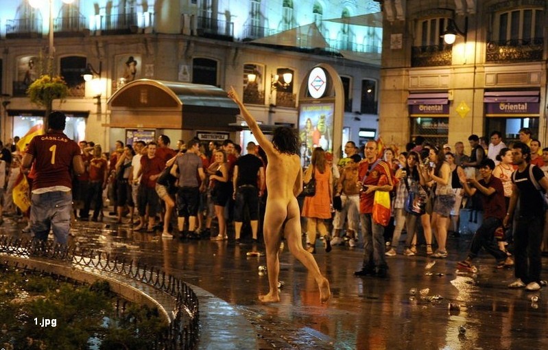 西班牙1:0勝德國晉級南非世界杯決賽,西班牙球迷狂歡,美女帥哥齊齊濕身,各地都是歡慶的人群,在馬德里更是有球迷全裸奔慶祝。