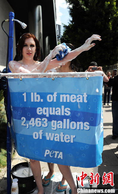 )好萊塢女子街頭裸浴,2011年3月22日世界水日街頭宣傳,美國洛杉磯,兩名善待動物組織女成員在好萊塢街頭上演了一場街頭裸體沐浴表演,宣傳“世界水日”,并揭露食肉對地球的危害,提倡素食生活。