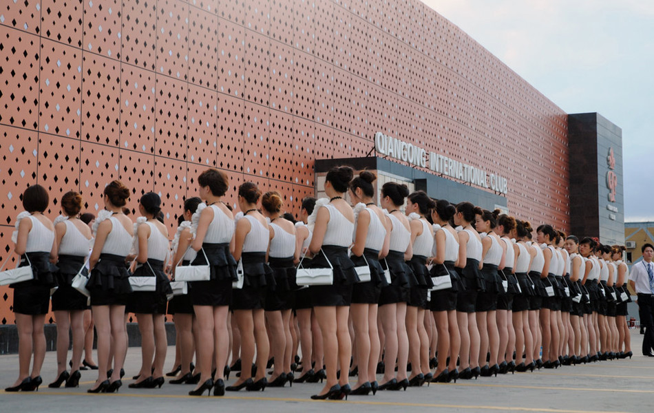 城西街道一家KTV門口,眾多身穿超短無袖職業裝的KTV從業人員集體接受領班訓話。浙江溫嶺市:KTV小姐集訓,陣容強大,隊伍排列整齊好比閱兵式。