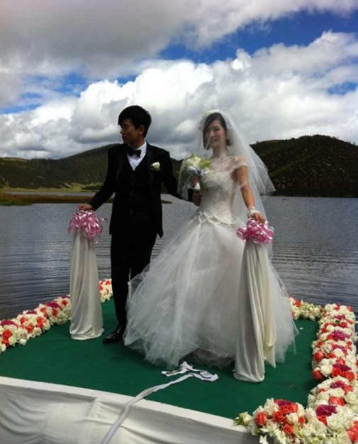 直擊謝娜張杰婚禮現場,2011年9月26日,云南迪慶,張杰和謝娜在迪慶普達措國家森林公園內舉行婚禮。圖為婚禮現場,張杰和謝娜乘坐婚船,準備駛向幸福的彼岸。(圖片來源:微博)