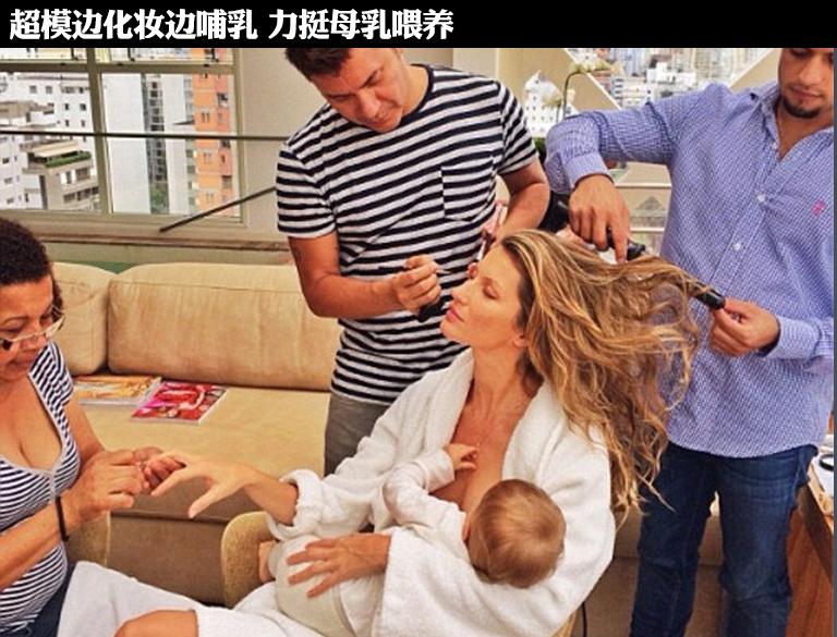 吉賽爾曬哺乳照支持母乳喂養(yǎng),在推特(Tweeter)上曬出一張邊化妝邊哺乳的照片,超模吉賽爾在公開場合給嬰兒喂奶,并稱此舉是大力支持“母乳喂養(yǎng)”,超模吉賽爾曬哺乳照在網(wǎng)上引起廣泛的關(guān)注,對推動(dòng)母乳喂養(yǎng)有積極影響。