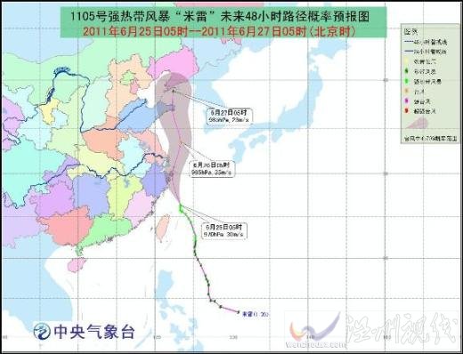 中央氣象臺(tái)6月25日06時(shí)繼續(xù)發(fā)布臺(tái)風(fēng)黃色預(yù)警:今年第5號(hào)強(qiáng)熱帶風(fēng)暴“米雷”的中心6月25日05時(shí)位于浙江省舟山市南偏東方410公里左右的西北太平洋洋面上,就是北緯26.4度、東經(jīng)123.3度,中心附近最大風(fēng)力有11級(jí)(30米/秒),中心最低氣壓為970百帕。