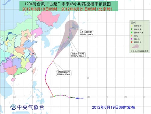 6月18日晚上今年第4號強臺風 “古超”(Guchol)已于減弱為臺風,6月19日05時其中心位于北緯28.5度、東經131.2度,就是日本國四國島高知縣南偏西方大約600公里的西北太平洋洋面上,臺風“古超”中心附近最大風力有13級(40米/秒),臺風“古超”中心最低氣壓為960百帕。