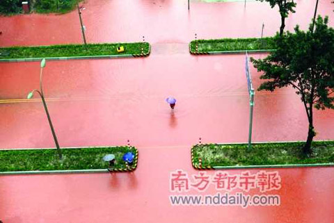 佛山高明區滄江路,一名市民走過被山泥染紅的封鎖的街道。南都記者郭繼江攝
