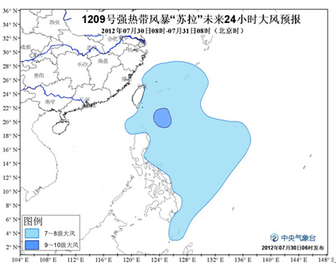 在7月30日08時到31日08時,巴士海峽、巴林塘海峽、臺灣以東洋面、東海南部將開始受今年第九號臺風蘇拉的影響。預計上述海域將出現8-10級大風,部分海域還將出現11-12級陣風。當地的漁船需注意防范臺風的影響。