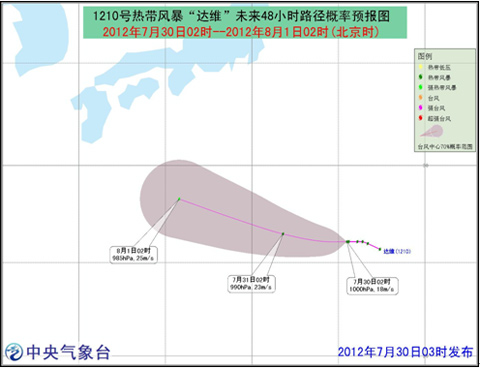 7月30日05時,今年第十號臺風達維中心移至日本東京南偏東方約1250公里的西北太平洋洋面上,就是北緯25.5度,東經145.4度,臺風中心附近最大風力有8級(18米/秒),臺風中心最低氣壓為1000百帕。