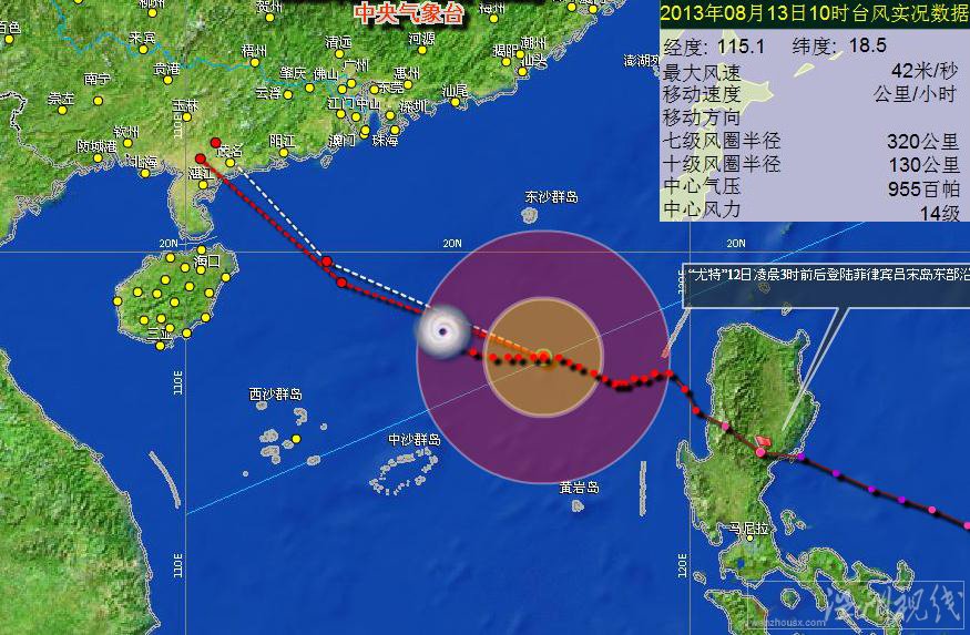 溫州臺風(fēng)網(wǎng) 最新消息,在8月13日上午8時,2013年11號臺風(fēng)尤特強度又升級至14級,目前臺風(fēng)中心位置距吳川市約550公里,預(yù)計14日上午會在廣東吳川市沿海登陸。