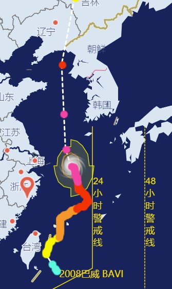中央氣象臺預計,臺風巴威正以時速10-15公里向偏北方向移動,強度繼續加強,最強可達14-15級強臺風,風速最大有45-50米/秒,8月26日上午,臺風中心將移入黃海南部,并向朝鮮半島西北部到我國山東半島一帶沿海靠近,強度逐漸減弱。