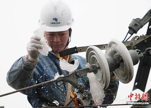 近日,中國(guó)南方地區(qū)出現(xiàn)新一輪低溫雨雪天氣過程。南方電網(wǎng)積極應(yīng)對(duì)開展大規(guī)模線路融冰除冰。在一些山區(qū),電力工人采取人工除冰方式保證電力線路正常運(yùn)行。圖為1月10日電力工人正在廣西融安縣板欖鎮(zhèn)東嶺村的高寒山區(qū)清除電力設(shè)施上的凝冰。中新社發(fā) 譚凱興 攝