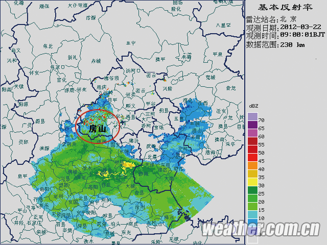 22日凌晨開始,降雨云系開始在北京以南的河北中南部旺盛發(fā)展。今天上午9點(diǎn),降雨云系向北京的西部發(fā)展,一直蔓延到主城區(qū)西側(cè)和延慶南部,不過9時(shí)30分前后開始,降雨云系再次向西南方向撤離,11時(shí)則主要集中在在房山區(qū)的西部地區(qū),回波強(qiáng)度基本維持在10-25DBz,以短時(shí)降雨天氣為主。
