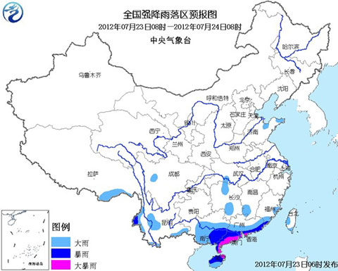 根據7月23日中央氣象臺發布的最新暴雨天氣預報。在23日08時至24日08時,廣西大部、福建東部、云南西部和南部、江西南部、湖南南部和北部、山東半島東部和北部等多個省份將出現大雨或暴雨天氣,另外,在廣東南部沿海以及海南東北部還將出現大暴雨天氣(預計降雨量達100~200毫米)。上述地區在降雨天氣的同時還將有短時雷暴大風等強對流天氣的出現。