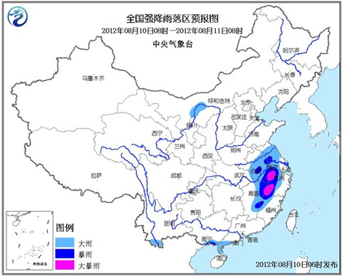 根據氣象臺預計 在8月10日08時至11日08時,江蘇大部、安徽中南部、江西東部、浙江西部、福建西北部、廣西南部、廣東南部、云南南部以及內蒙古河套地區等地將會出現大到暴雨。另外,在安徽南部、江西東北部、浙江西部等地的局部還將出現大暴雨天氣(預計降雨量達100~200毫米);上述部分地區并伴有雷暴大風等強對流天氣。