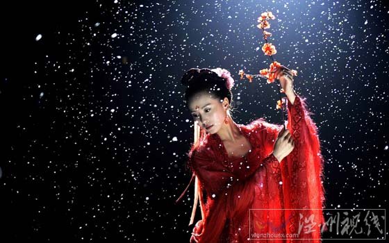 這也許將是劇中最唯美的一段,發生在若曦與八阿哥的感情萌芽階段。若曦在大雪中隨性而走,感受著“天地之間我獨行”的寂寥,八阿哥不知什么時候出現,悄悄地跟在身后,兩人就這樣默默行走在一片蒼茫之中,默然無語。若曦一個趔趄,八阿哥趕緊去扶,隨之握住了她的手。若曦大紅羽縐面白狐貍皮的斗篷在皚皚白雪中異常美麗。