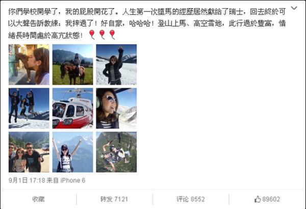 鄧紫棋度假墜馬:鄧紫棋微博曬瑞典度假的照片。