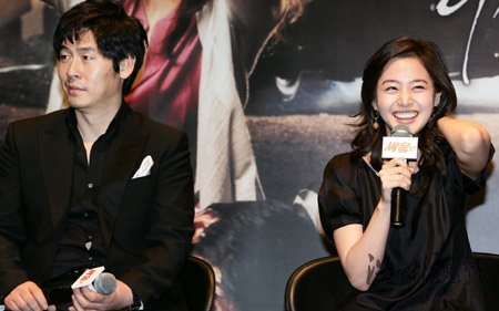 金泰熙主演的《打架》制作發布會在狎鷗亭洞CGV影院舉行,圖為主演薛景求(左)和金泰熙回答記者提問。