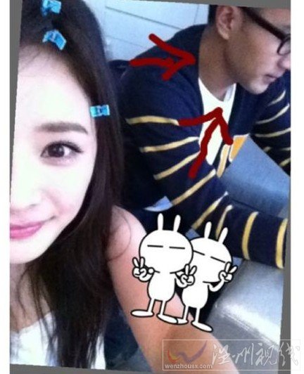 楊冪還上傳了一張自拍的與劉愷威一起的照片,照片中楊冪打扮粉嫩,頭上有三個發夾,十分可愛,后面的劉愷威沒有發現楊冪在玩自拍,帶著眼鏡低頭在研究什么。楊冪還很有創意地在照片上貼上兩只親密的兔斯基,并涂鴉上兩個小紅箭頭指向劉愷威。