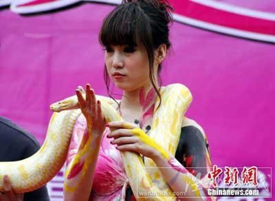 表演其間,張小雨還與南寧動物園的一條黃金大蟒蛇同臺“獻(xiàn)藝”,一百多斤的大蟒蛇緊緊纏在張小雨瘦小的身上,不時伸出舌頭,讓在場觀眾倒吸了一口涼氣。