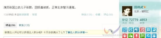 今日21:10分左右,北京青年報常務(wù)副總編田科武在微博上曝出,知名演員、導演張國立之子張默因涉嫌吸毒被抓,“演員張國立的兒子張默,因吸毒被抓,正等北京警方通稿。截止止當日22:05分,該微博已被轉(zhuǎn)發(fā)1393次,評論281次。十幾分鐘后,北京青年報北京新聞版通過官方微博曝光了更多細節(jié),“昨天晚上22時40分,順義警方接到群眾舉報,位于順義天竺一別墅區(qū)內(nèi)有人吸毒,警方接報趕至,當場抓獲兩名涉嫌吸毒人員,其中一人為張國立的兒子張默。所吸食的毒品為大麻。此案目前正在處理中,張默的人身自由并未被限制。”截止當日22:05分,該微博已被轉(zhuǎn)發(fā)2006次,評論374次。