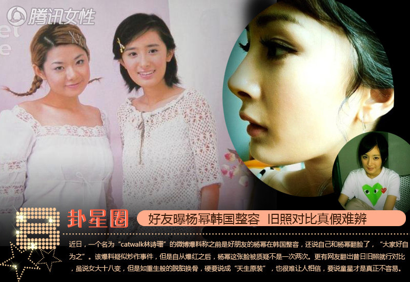 楊冪整容傳聞一直沒有停止過,最近楊冪整容又有了“好友版”,一個自稱是楊冪閨友“catwalk林詩珊”微博爆料稱楊冪在韓國整容,還說自己和楊冪翻臉了,楊冪稱不認識“catwalk林詩珊”,這又是一次借楊冪的名氣炒作的惡意中傷。