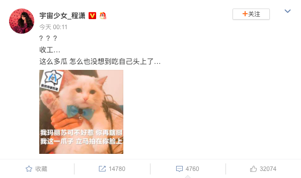 最逗趣的就是她辟謠用的配圖,圖片上是程瀟抱著自己家的貓SUSU,把自己頭用很傷心的表情包糊上了,而貓咪則是抬起爪子要打人的狀態(tài)。底下還配上了“我瑪麗蘇可不好惹,你再瞎掰,我這一爪子,立馬拍在你臉上”的字眼,算是借貓咪之口說出自己的心聲,很幽默也很高情商!