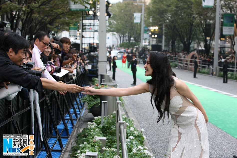 張馨予透視裝亮相第24屆東京國際電影節開幕式,圖為張馨予穿在真空透視裝在綠毯現場和粉絲握手。